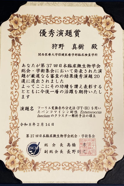 本研究会は関西圏の糖鎖研究者が集まり、年に1回開催されます。例年2位で受賞したことが多い優秀研究賞ですが、今年はトップでの受賞となりました。後期博士課程進学後も緒方さんの活躍に期待しています。