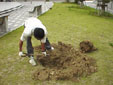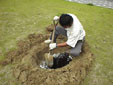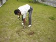 まずは、敷地の中で植樹に適しているのはどこかというのを事務の方と一緒に検討しました。中央側に植樹されるハナミズキと同等な位置に植樹するために、業者の人たちはできるだけ正確に測定を行っていました。 なお、植樹後のハナミズキの根本にもしっかりと芝生が育つようにするため、掘り起こしの段階で芝生が傷まないように気をつけながらの作業をしていました。